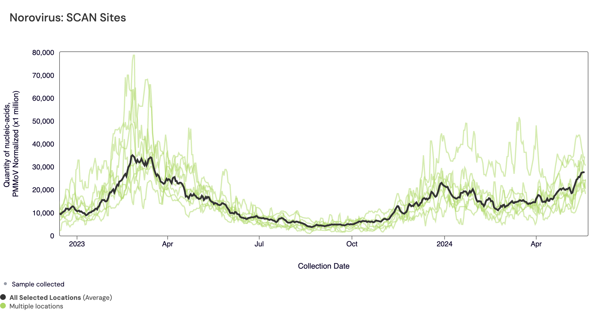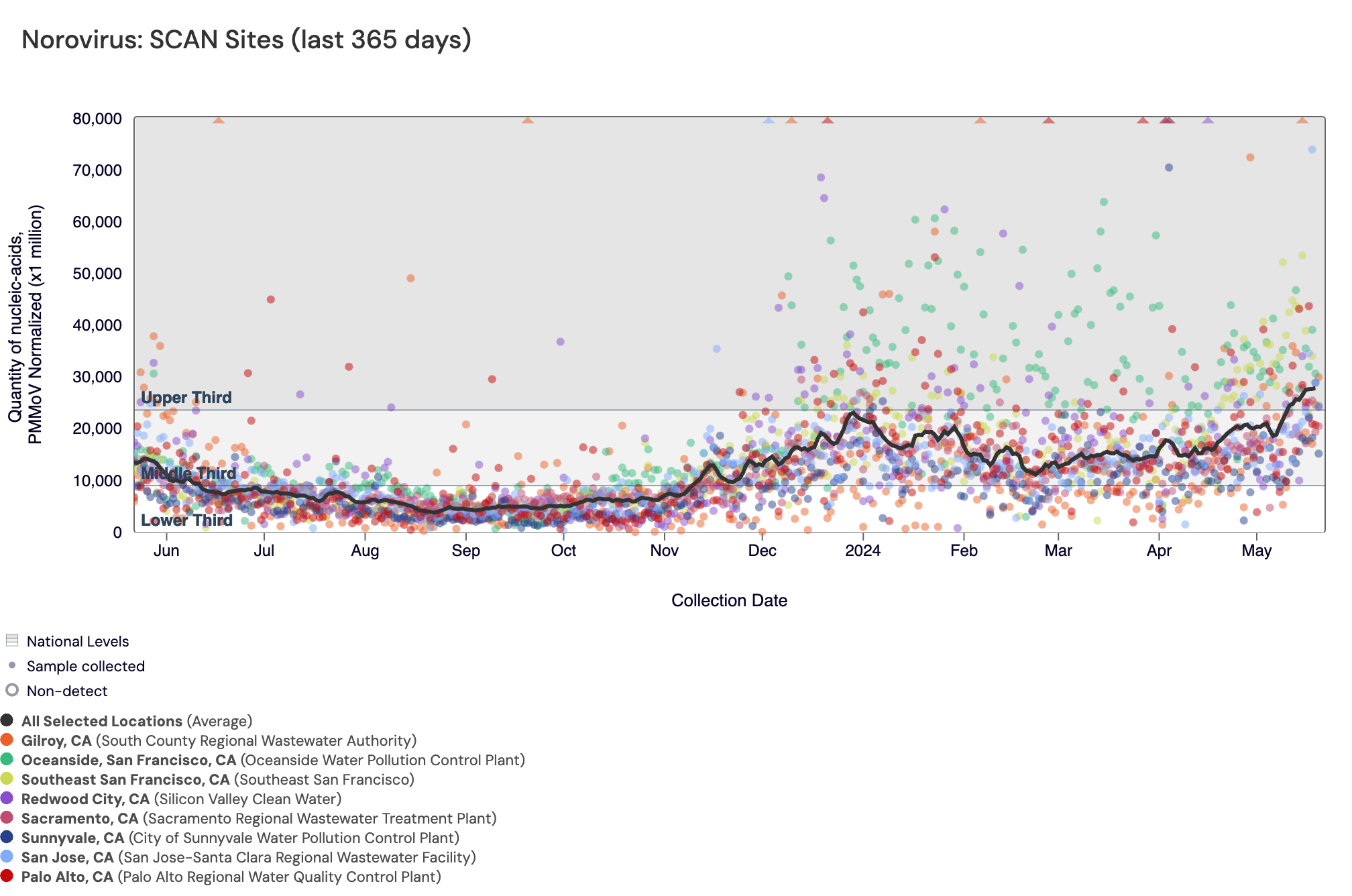 The plot below shows the Norovirus concentrations at the SCAN sites since we began monitoring in late 2022. The population weighted average line is shown in black. You can interact with the chart of all the plants at this link.