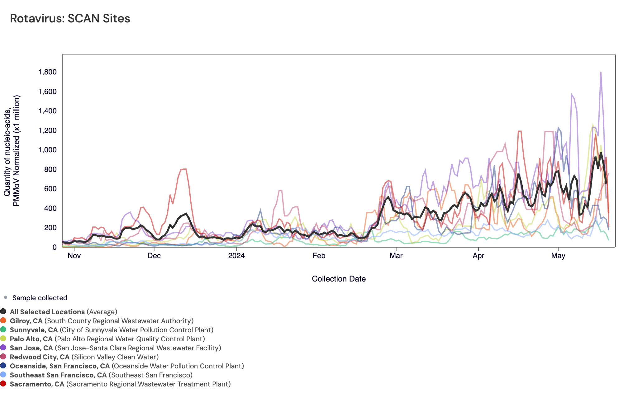 Norovirus GII RNA was commonly detected at all SCAN sites, which is what we are observing across the national WWSCAN sites as well. In the chart below, the population weighted average line across all the SCAN plants is shown in black and raw Norovirus data for the SCAN sites are shown as points. We've seen an uptick in Norovirus concentrations across most sites since early spring and concentrations are on average higher than they were this time last year.