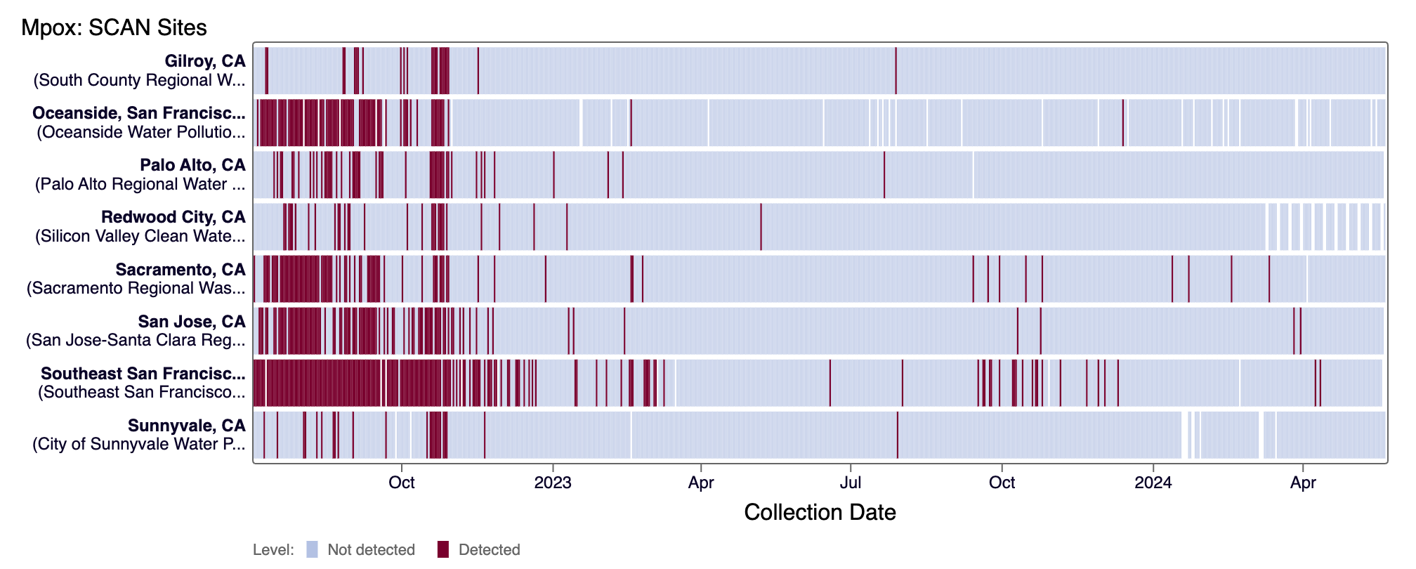 Mpox DNA was not detected at any SCAN sites recently. Currently all SCAN sites are in the 'LOW' category for Mpox.