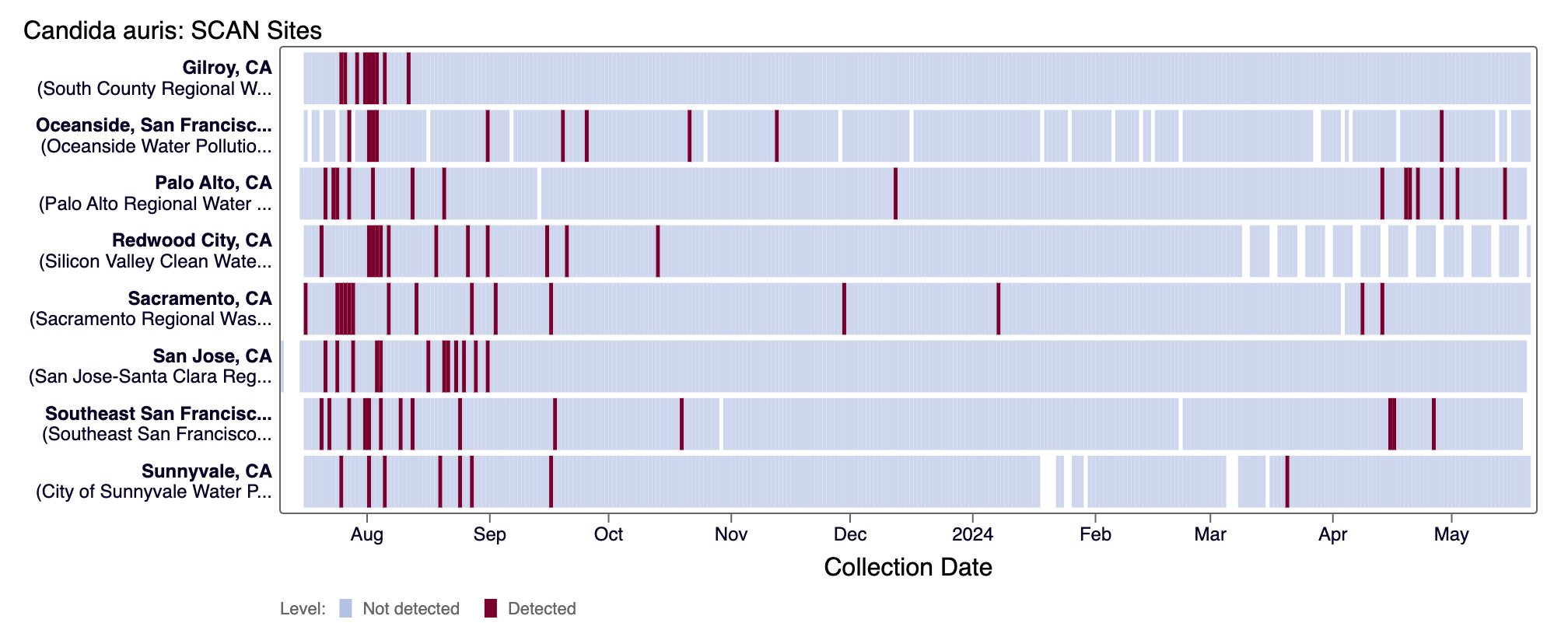 Candida auris DNA was not detected in the last 10 days at most SCAN sites (1 positive detection from Palo Alto on 5/14/24). Currently all SCAN sites are in the 'LOW' category for C. auris.