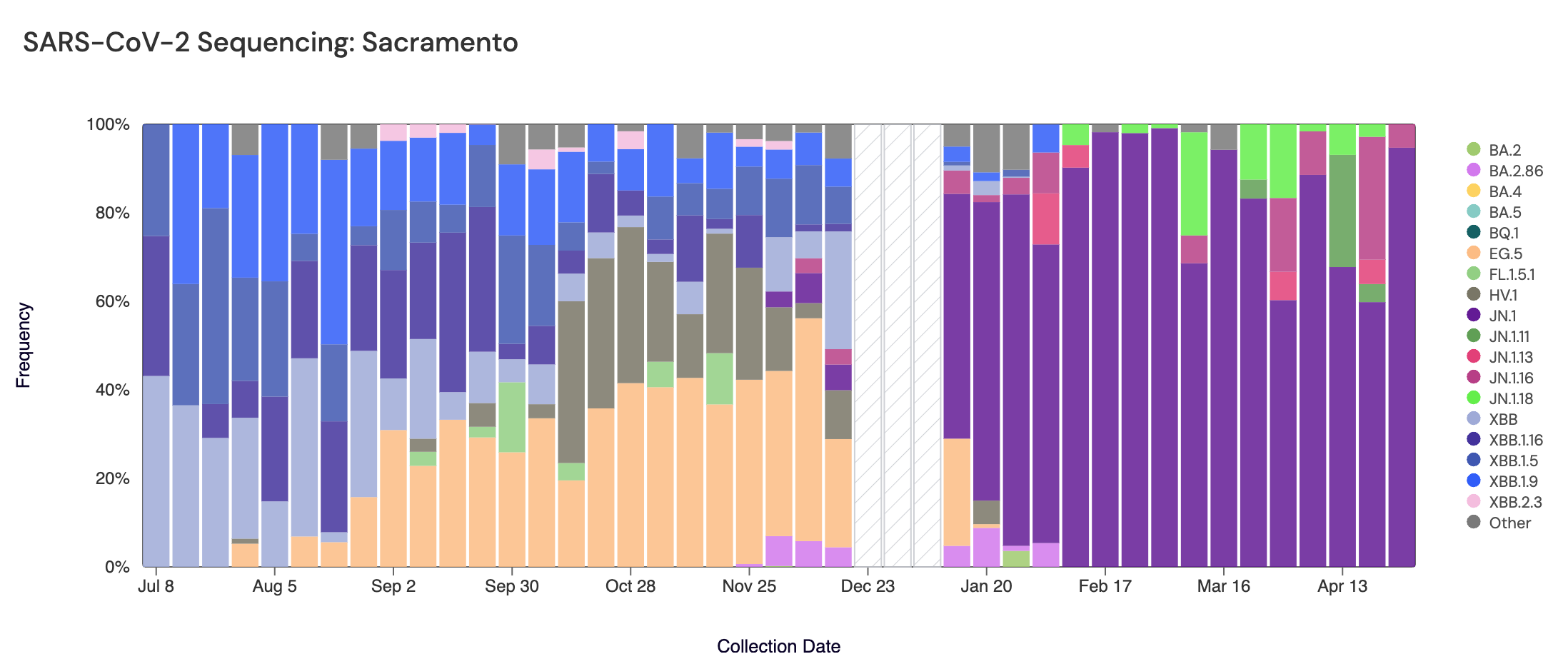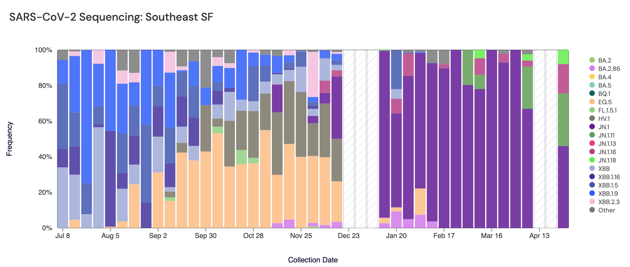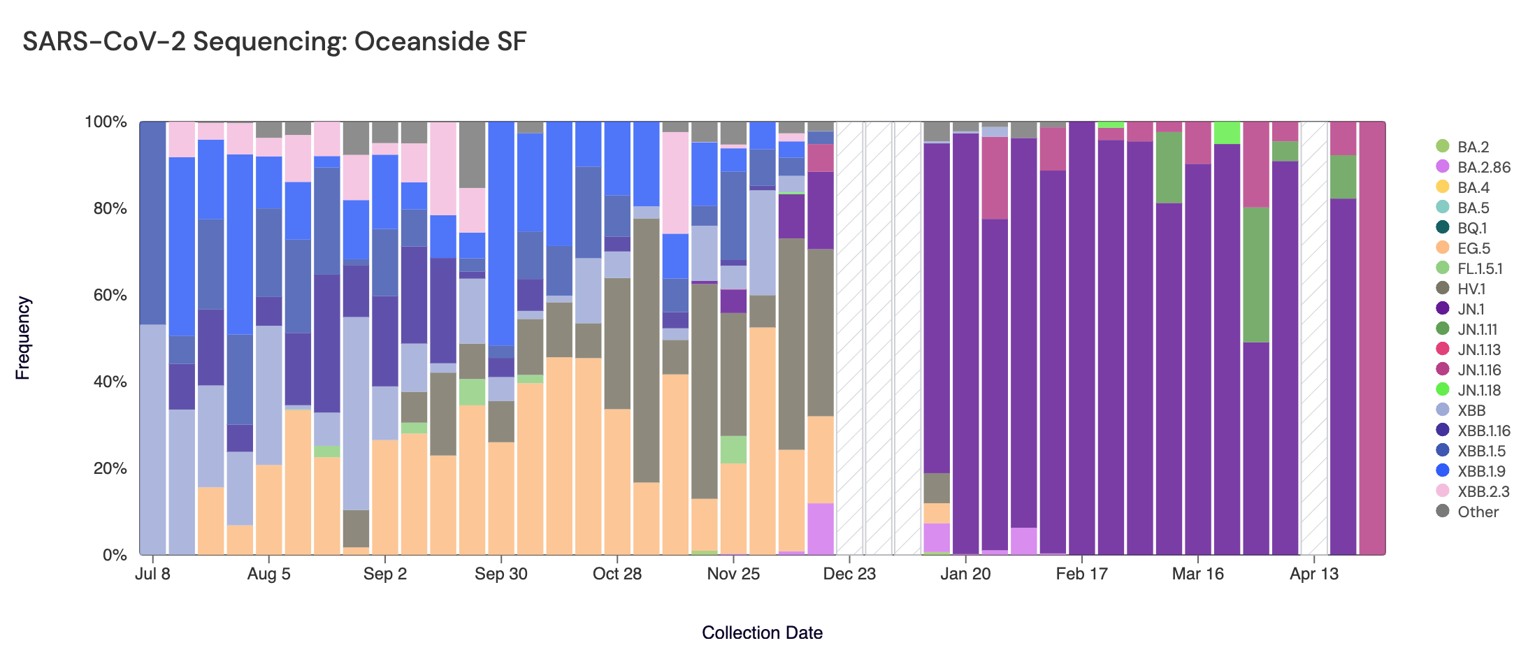 Below are plots from Oceanside SF, Sacramento, San Jose, and Southeast SF showing the relative proportions of different variants inferred from sequencing the entire genome of SARS-CoV-2. White and grey striped bars indicate no data is currently available for that week. Note that the sequencing data are always from samples taken between 1-2 weeks ago (in this case, April 27, 2024). As concentrations of SARS-CoV-2 continue to fall, it is becoming more difficult to sequence the samples. If concentrations continue to fall, we may need to pause sequencing.