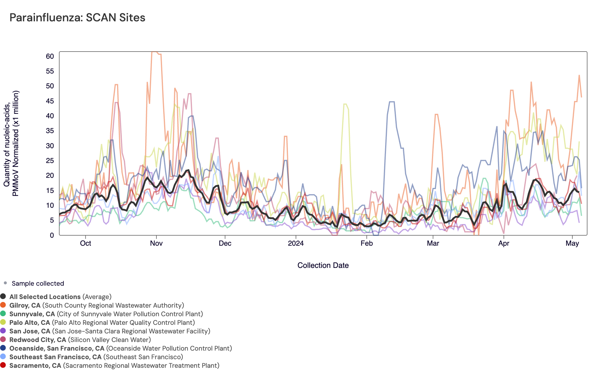 Parainfluenza RNA has consistently been detected in most samples collected from SCAN sites. The population weighted average across SCAN sites is shown in black. You can access the chart here.
