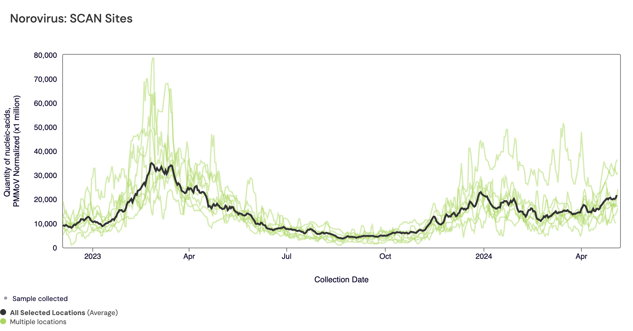 The plot below shows the Norovirus concentrations at the SCAN sites since we began monitoring in late 2022. The population weighted average line is shown in black. You can interact with the chart of all the plants at this link.