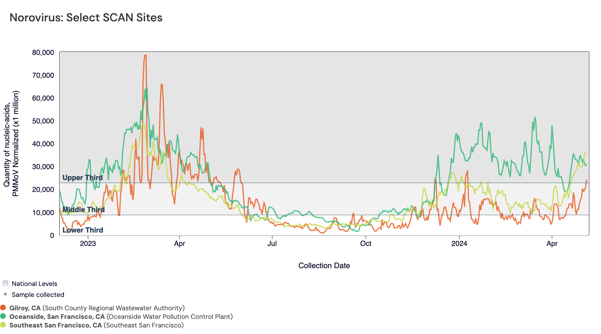 Norovirus GII RNA was commonly detected at all SCAN sites, which is what we are observing across the national WWSCAN sites as well. Below is a plot with Gilroy (in red), Oceanside SF (in green) and Southeast SF (in yellow) showing relatively high levels being measured in daily samples.