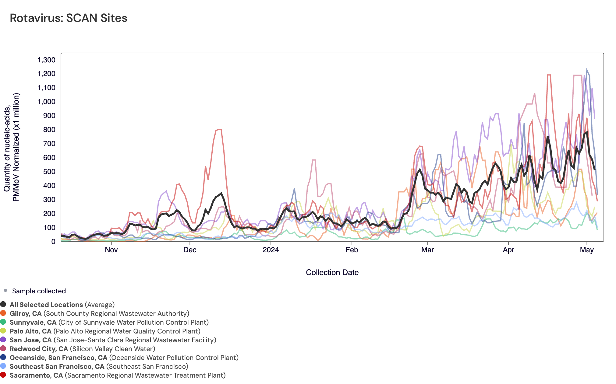Rotavirus RNA concentrations are shown in the chart below (all the SCAN plants are shown together) since mid Oct 2023. The population weighted average line is shown in black. You can interact with the chart of all the plants here.