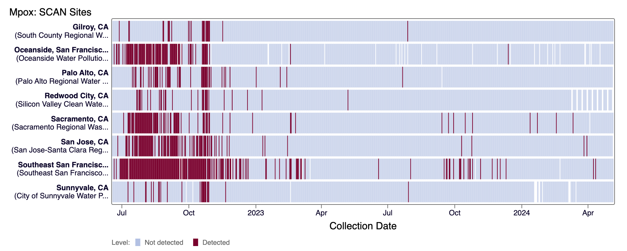 Mpox DNA was not detected at any SCAN sites recently. Currently all SCAN sites are in the 'LOW' category for Mpox.