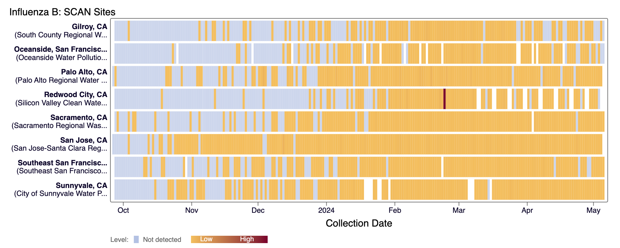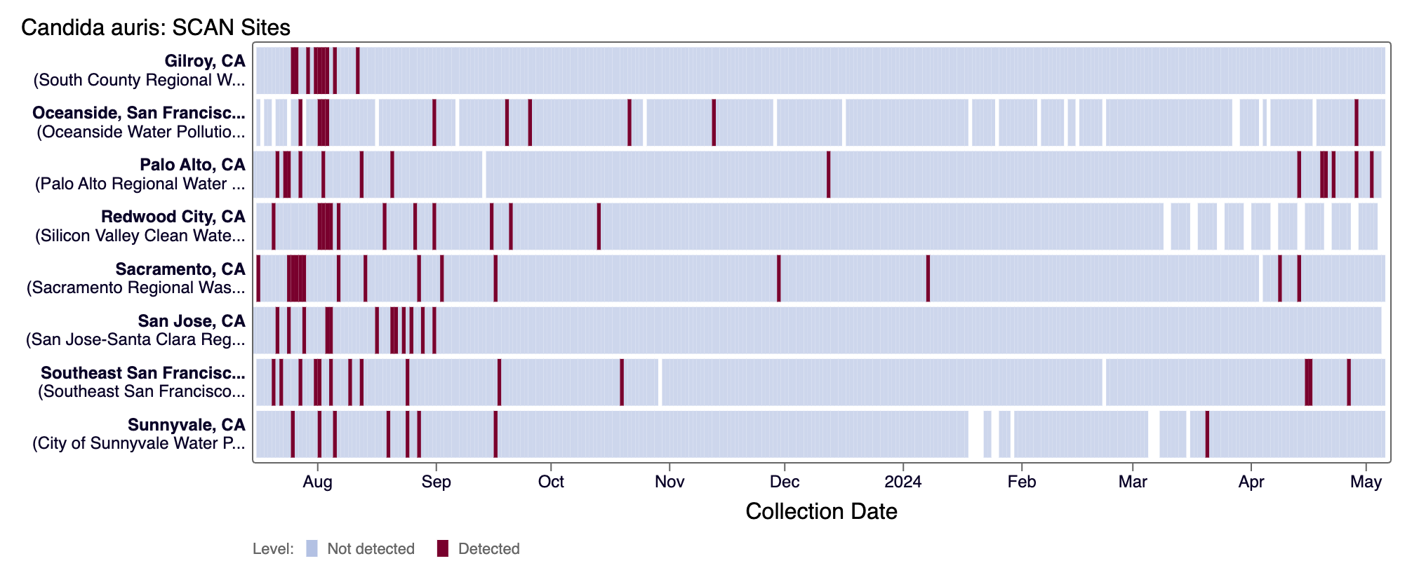 Candida auris DNA was not detected in the last 10 days at most SCAN sites (2 positive detection from Palo Alto on 4/28/24 and 5/2/24, and 1 positive detection from Oceanside SF on 4/28/24). Currently all SCAN sites are in the 'LOW' category for C. auris.