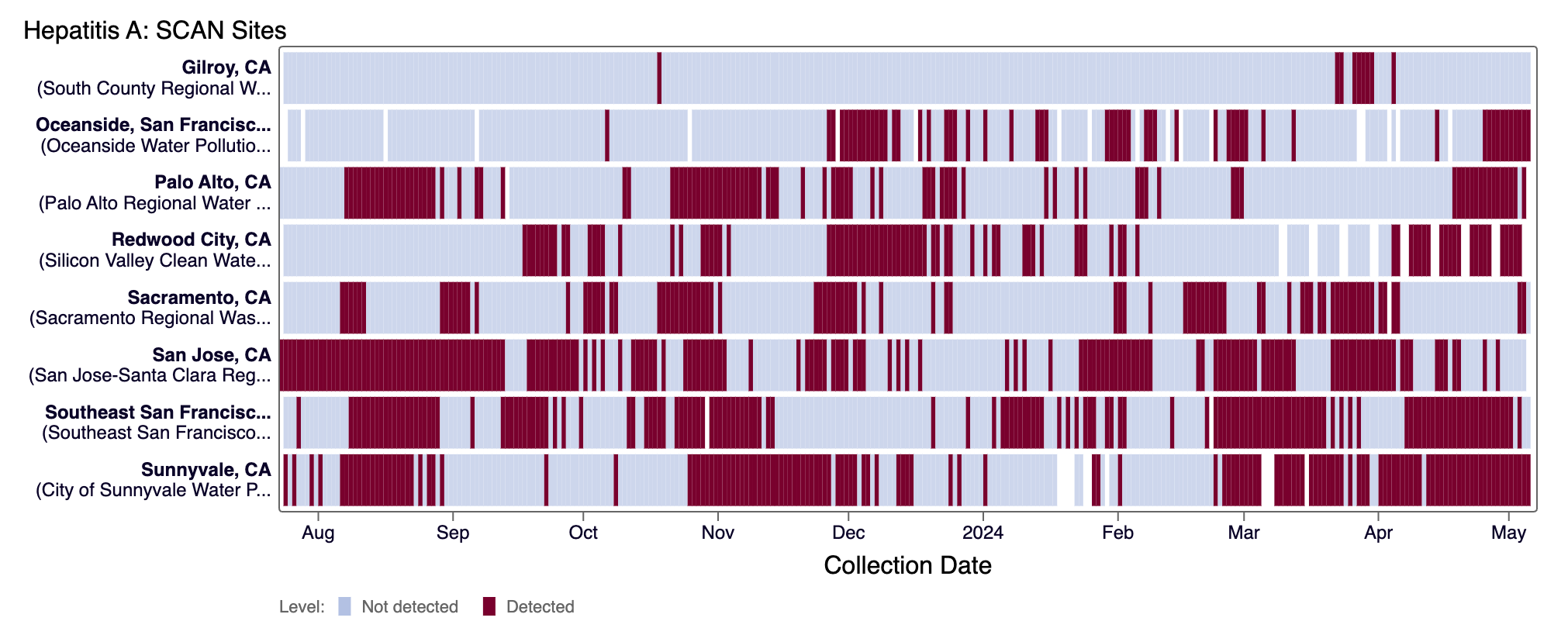 Hepatitis A RNA has been detected frequently at all SCAN sites in the last 10 days (minus Gilroy and Sacramento). Below are the current wastewater categories for the SCAN sites (the category is determined by the frequency of detection):