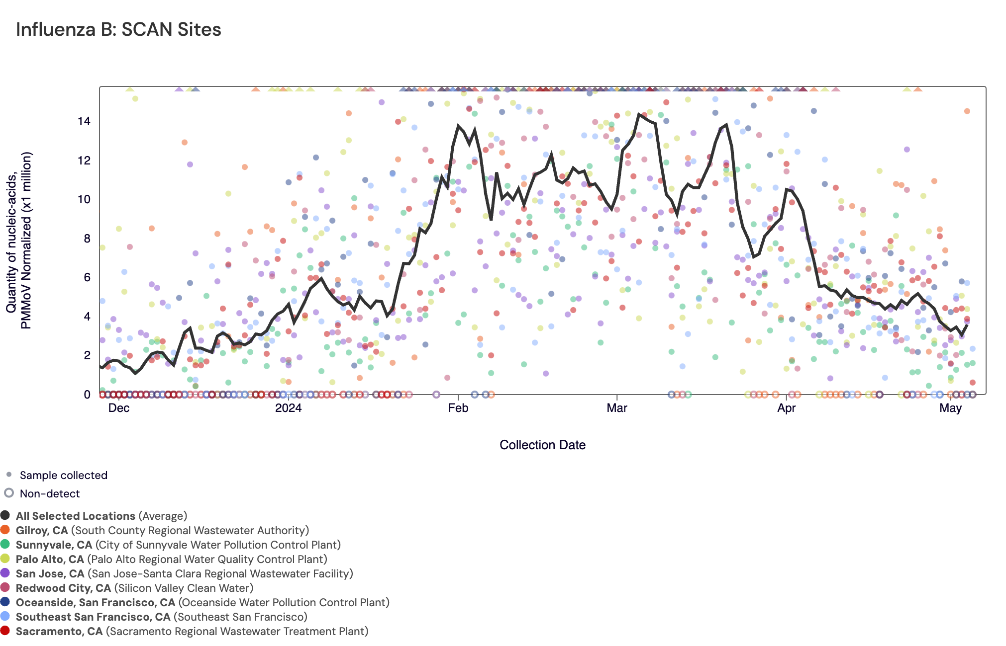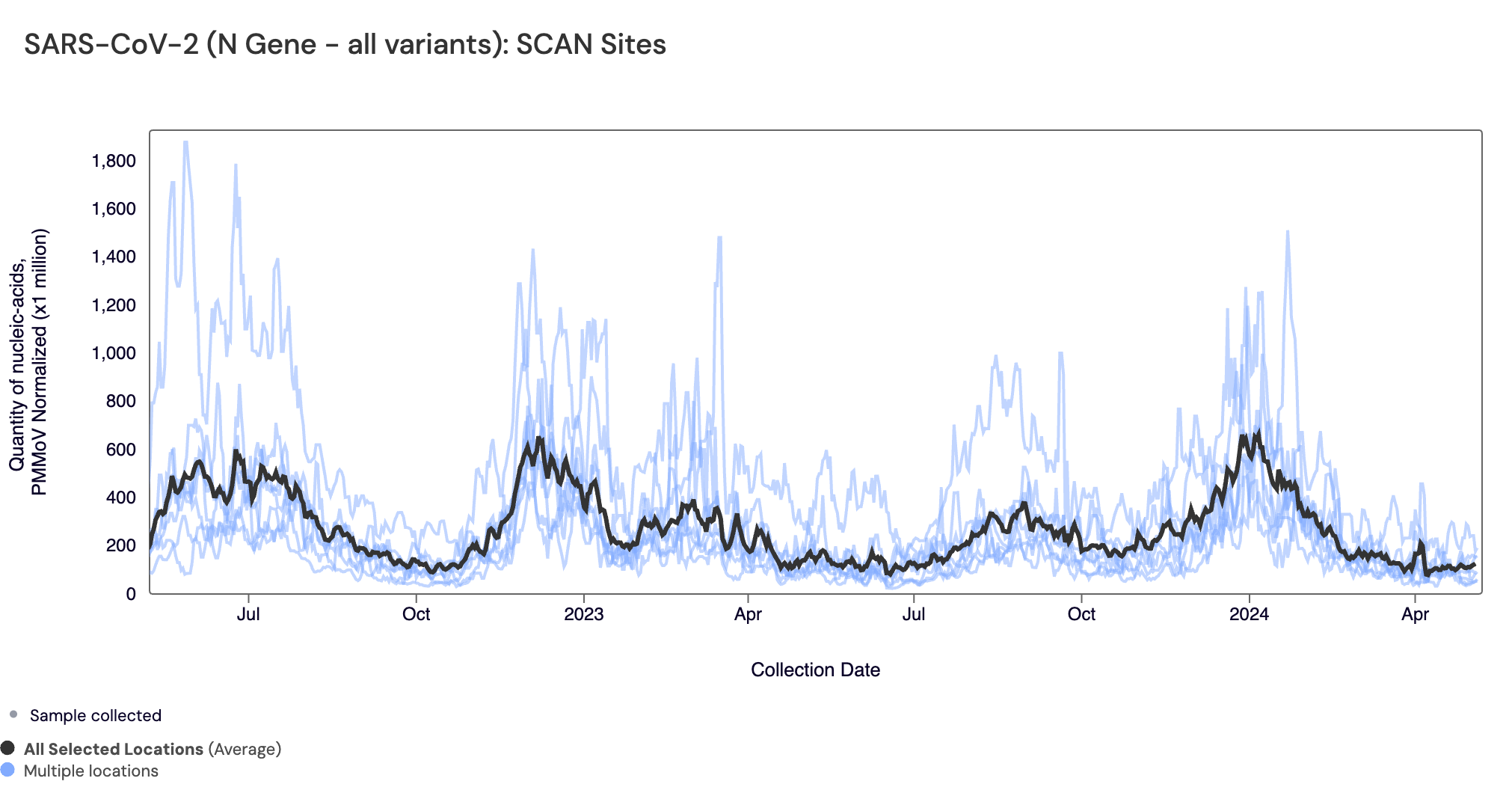 Below are all the data from all the SCAN plants for the last two years. You can access the graph here. The population weighted average across the SCAN plants is shown in black. The population weighted average has decreased from the last peak we saw at the end of 2023/beginning of 2024.