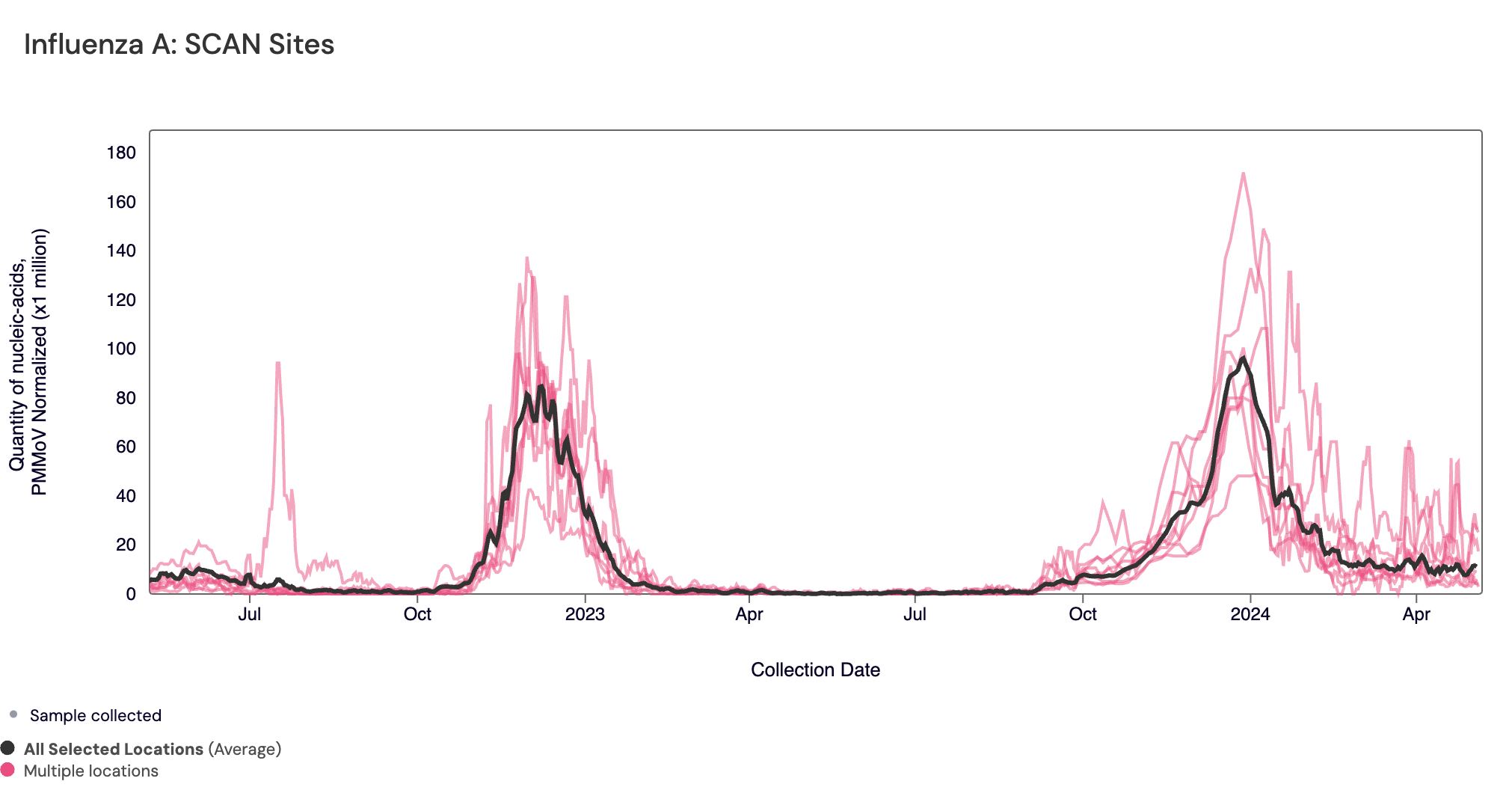 Influenza A (IAV) RNA: Below are all the IAV data from all the SCAN plants for the last two years. You can access the graph here. The population weighted average across the SCAN plants is shown in black. All SCAN sites are still in onset for IAV but have come down from the peak seen at the end of 2023/beginning of 2024.
