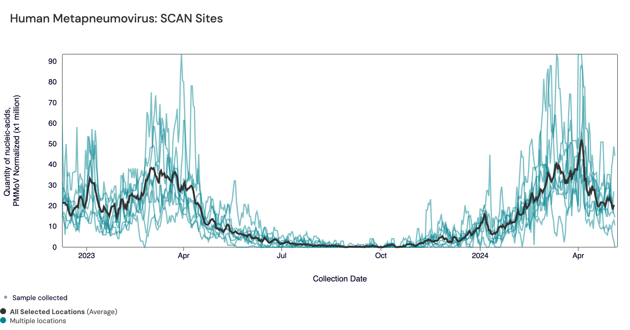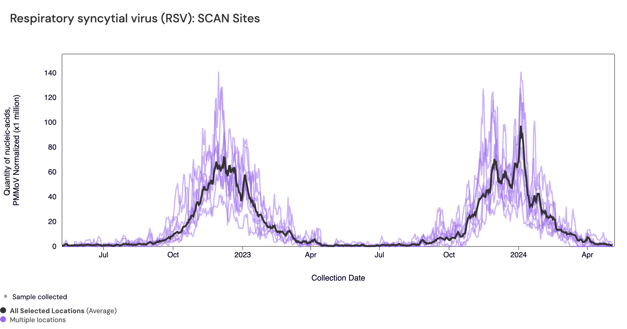 RSV RNA concentrations have decreased to low levels. In the chart below (representing data from the past 2 years), the population weighted average line across all the SCAN sites is shown in black, and you can see the current concentrations relative to the peak RSV levels from last year. The link to the chart below is here if you would like to interact with it.