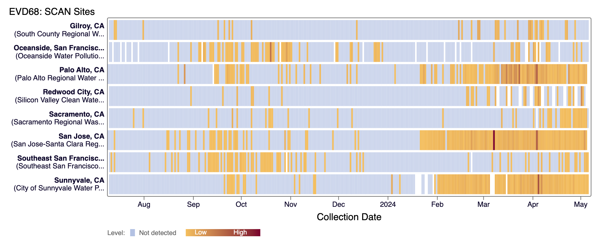 The heat map below shows all the SCAN sites as a row, and each date as a column since monitoring began in July 2023. The color blue means the sample was non-detect for EV-D68 RNA and the colors get darker with higher concentrations. White indicates no sample was collected. You can access the chart here.