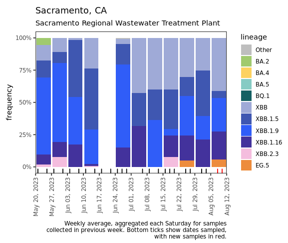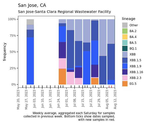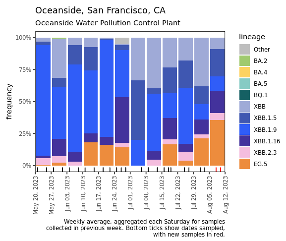 Below are plots from Oceanside, Sacramento, and San Jose showing the relative proportions of different variants inferred from sequencing the entire genome of SARS-CoV-2. Samples with low coverage are not being displayed in the plots (this explains some empty columns for Sacramento and San Jose). You can see that the sublineage EG.5 appearing in the data (in orange), especially in Oceanside which coincidently is also the site which has the highest concentrations of SARS-CoV-2 RNA. EG.5 is an Omicron sublineage that has emerged in other parts of the world and has been causing infections in the US. You can read more about it here. Note that the sequencing data are always from samples taken between 1- 2 weeks ago. We have not detected BA.2.86 in any samples yet, but it should be easy to detect when it is present because it has some characteristic deletions and a large insertion. BA.2.86 was detected in a wastewater sample somewhere, as describe in this press release from CDC.