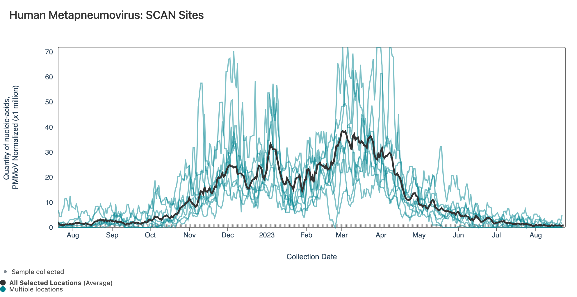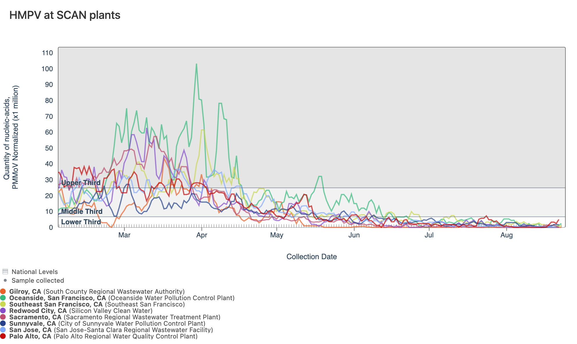 HMPV (human metapneumovirus) RNA concentrations are low at most of plants in SCAN. Below are charts showing data from all the SCAN plants together (link here to this chart if you want to interact with it).
