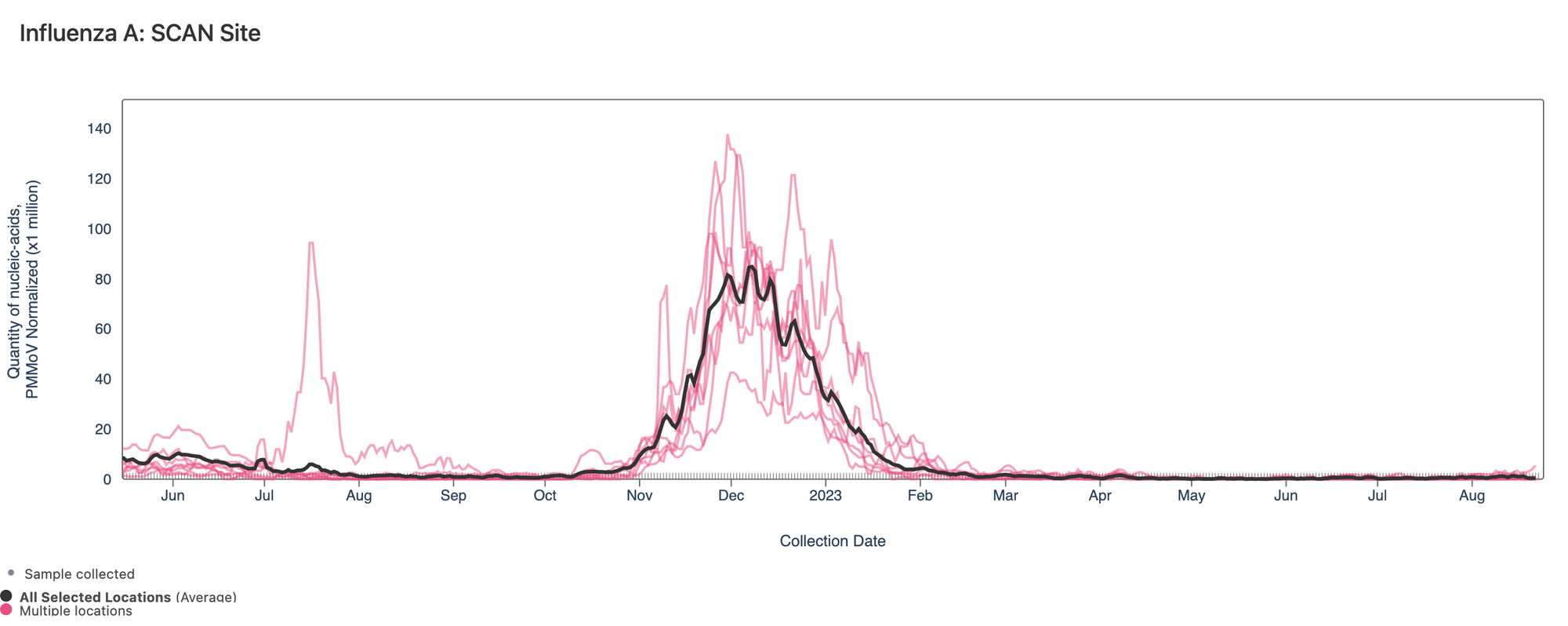 Influenza A (IAV) RNA concentrations are very low across the SCAN plants. Concentrations are generally non-detects in samples from recent weeks. The link to the chart below is here if you would like to interact with it. The population weighted average line across all the SCAN plants is shown in black.