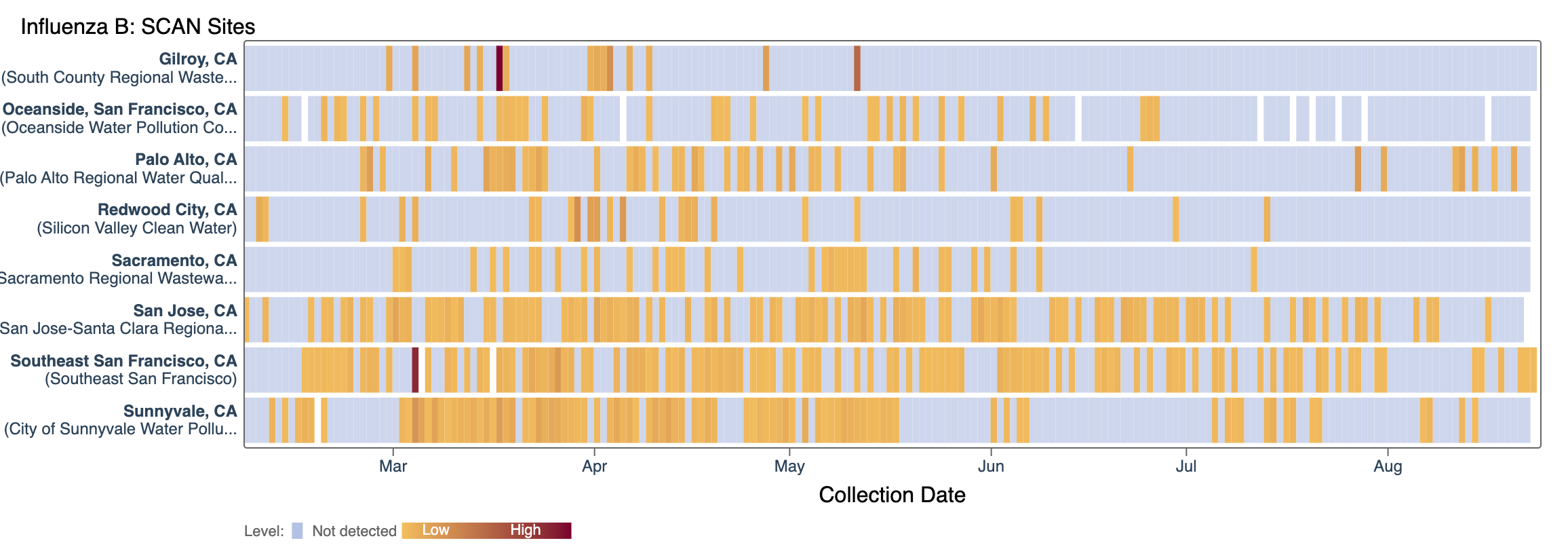 Influenza B (IBV) RNA is sporadically detected at low concentrations at the SCAN plants since early 2023. Each plant is represented by a row (y-axis), and dates are shown along the x-axis. Blue indicates a non-detect, and darker orange/red is proportional to concentration with the highest values being darkest. A white means no sample was collected. Here is the link to the heat map chart - the linked chart will update automatically as more data are added to the site.