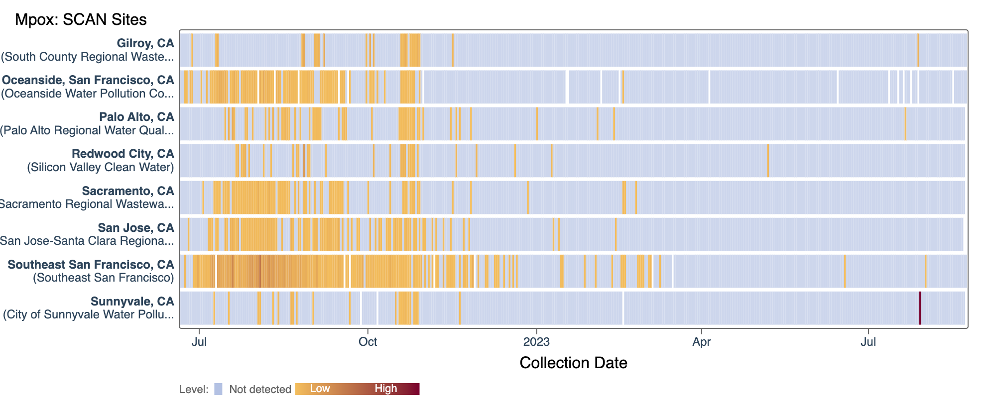 We've observed non-detects in the last 14 days for MPXV DNA at most of the SCAN plants. The heat map show all the SCAN sites as a row, and each date as a column. The color blue means the sample was non-detect for MPXV DNA and the colors get darker with higher concentrations. White indicates no sample was collected. The charts shows all the data we have collected, almost a year's worth of data. You can access the chart here.