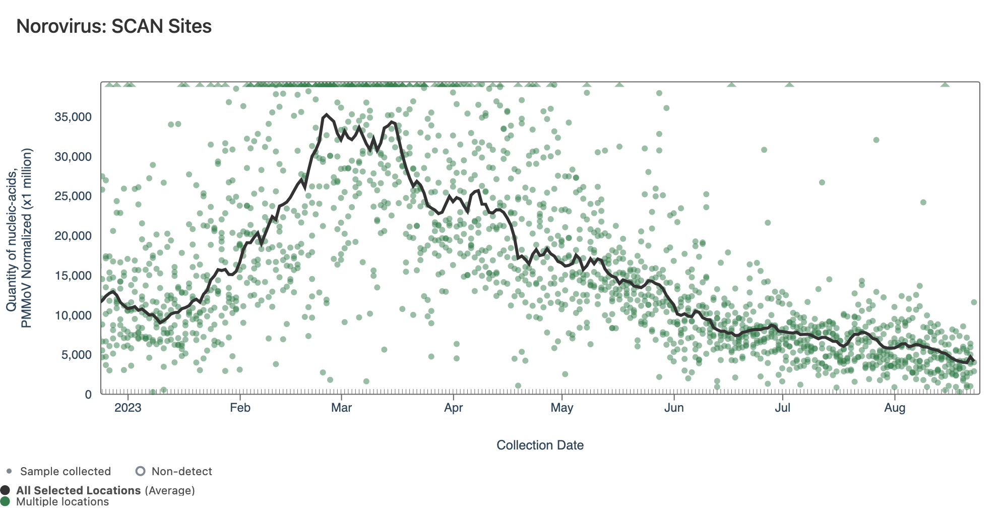 Norovirus GII RNA concentrations are shown in the chart below; all the SCAN plants are shown together. The population weighted average line is shown in black, and that line shows decrease over the last couple weeks. You can interact with the chart of all the plants at this link.