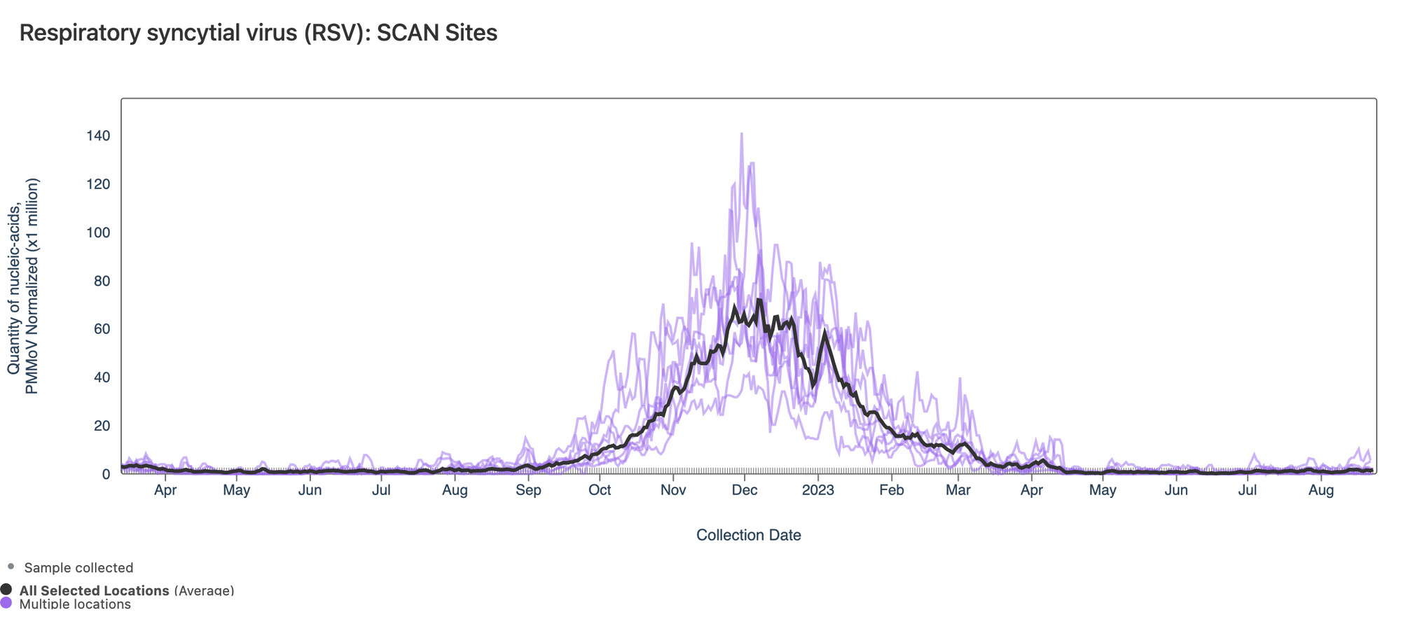 RSV RNA has not been detected in most samples in the past week. This plot shows data from all the SCAN sites together since last winter and can be access here. The black line is the population weighted average.