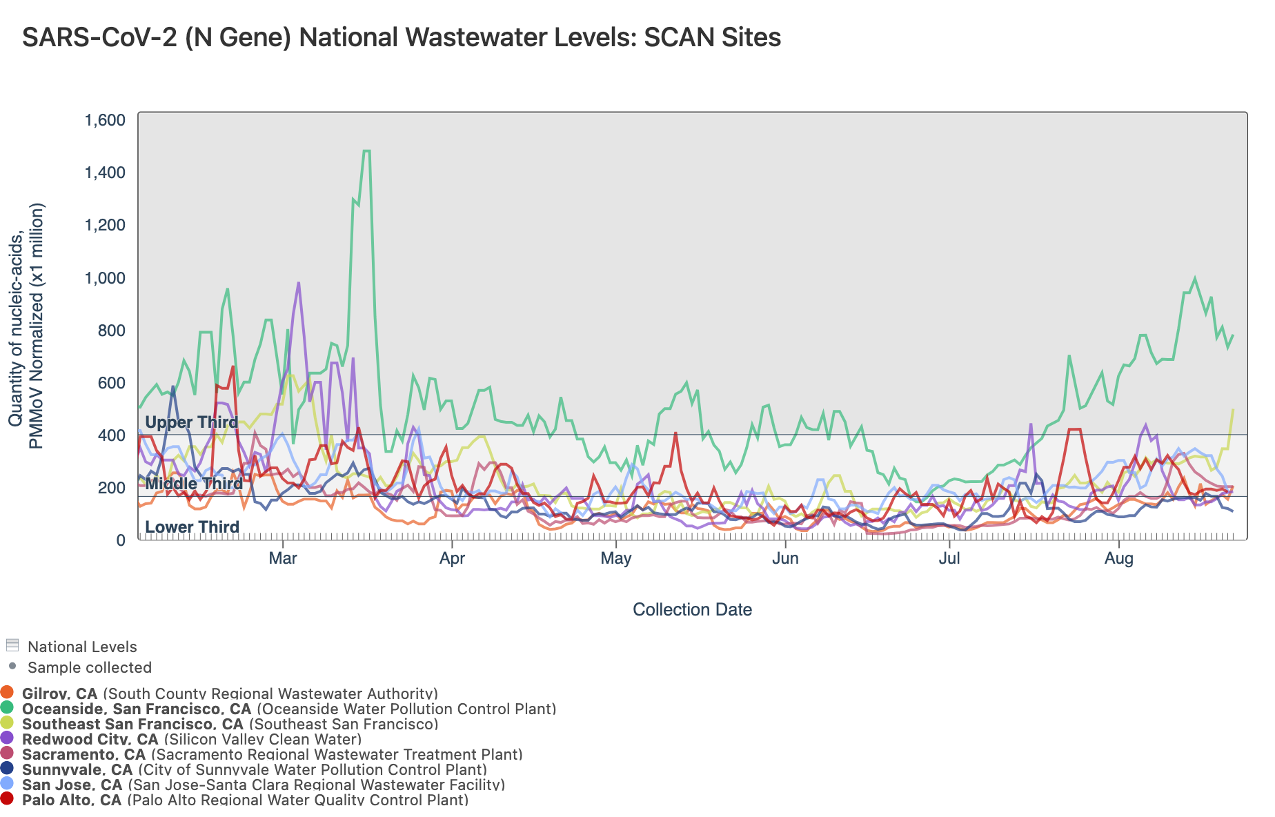 Below is a chart showing the National Levels benchmarks superimposed on the SARS-CoV-2 N gene data from the SCAN sites over the last 6 weeks. Currently SCAN sites SARS-CoV-2 N gene concentrations at Sunnyvale is in the bottom third level, Gilroy, Palo Alto, Sacramento, San Jose, and Silicon Valley Clean Water are in the middle third level, and Oceanside and Southeast SF concentrations are in the top third level. You can access the graph here.
