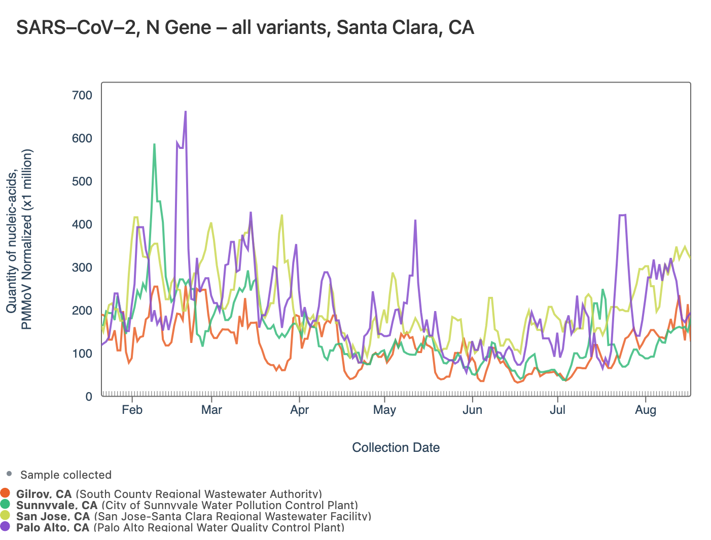 We ran a 2-week look period trend analysis on the plants for the N gene target using methods outlined in this peer-reviewed paper by our team (link to paper). The 2-week look period trend analysis on SARS-CoV-2 at SCAN plants indicates a significant downward trend at Silicon Valley Clean Water, and no trend at the other plants.