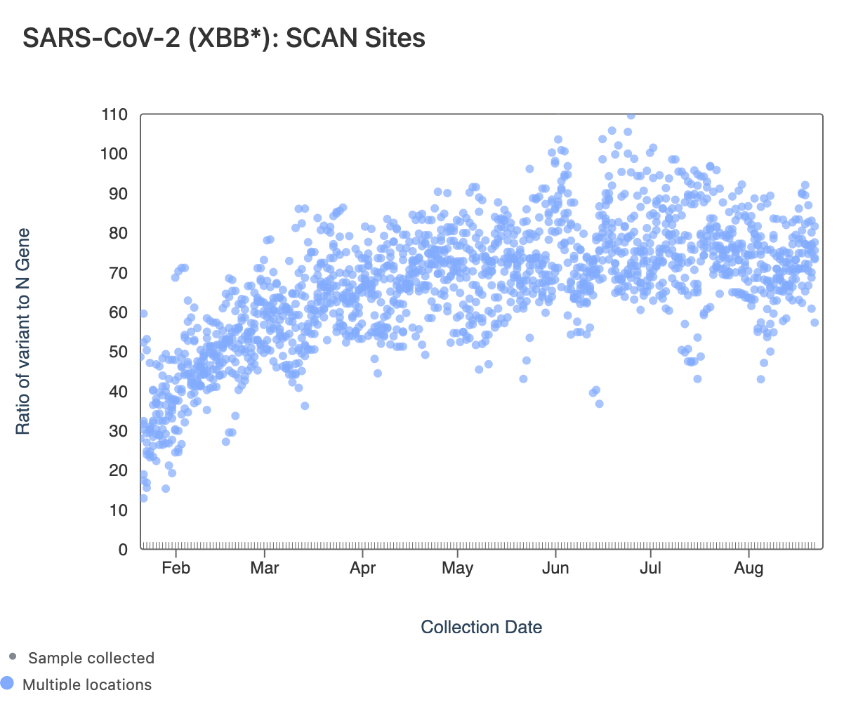 The ratio of the XBB* mutations/N across SCAN plants is shown in the chart below. This chart comes from data.wastewaterscan.org (link here to the chart). As the ratio reaches 100%, it suggests that all the SARS-CoV-2 genomes in wastewater have the XBB* mutations. These data indicate that the regional average ratio XBB* mutations/N is ~70-80%. These data suggest that the majority of infections across the SCAN communities are caused by XBB*. Note that these set of mutations are also present in EG.5 sublineage. But they are not present in BA.2.86.